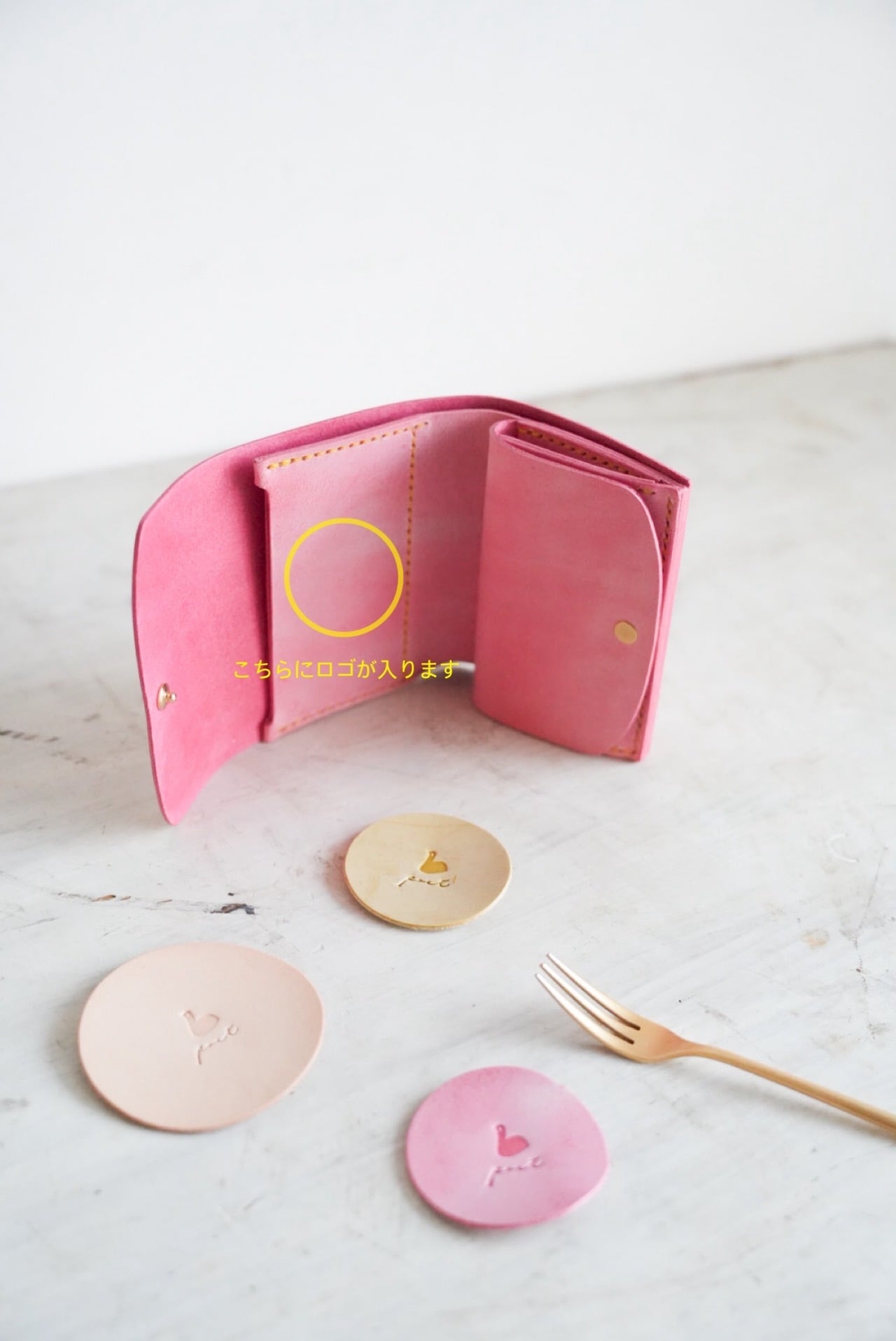 春の季節限定カラー「いちごミルク」色で仕立てた、シンプルで使いやすい3つ折り財布です。